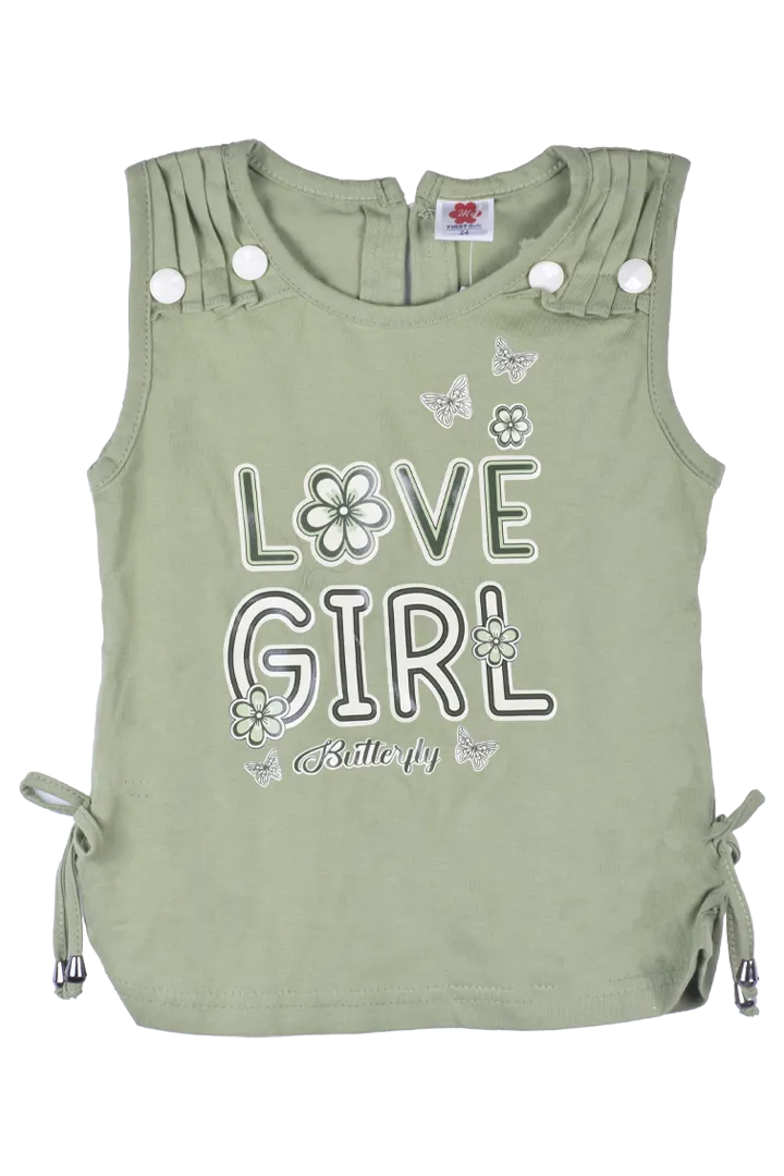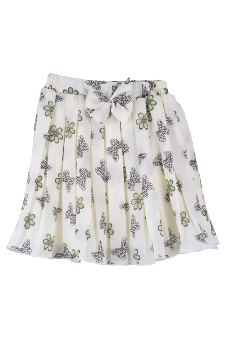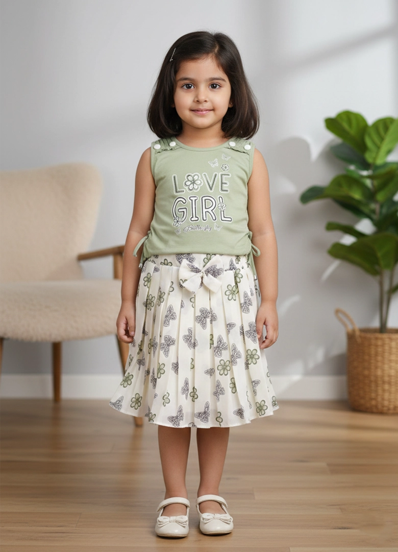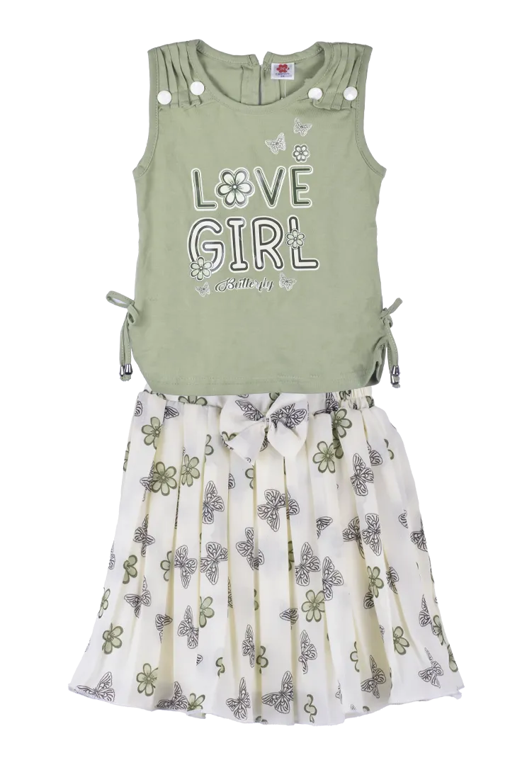 Printed (butterfly & floral skirt), Graphic text print on top (“LOVE GIRL”), Bow detail at waist, Bu